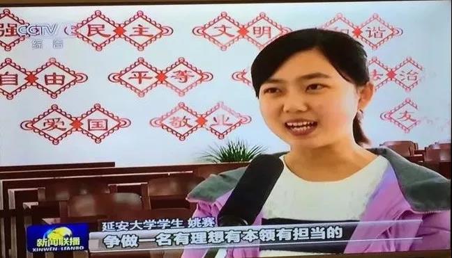 宣讲结束,姚赛作为学生代表接受中央电视台的采访,当谈及对宣讲党的十九大精神的看法时,她说:“作为一名延大的学生,在这片充满红色情怀的土地上更应该努力学习习近平新时代中国特色社会主义思想,争做一名有理想有本领有担当的新时代青年大学生。”