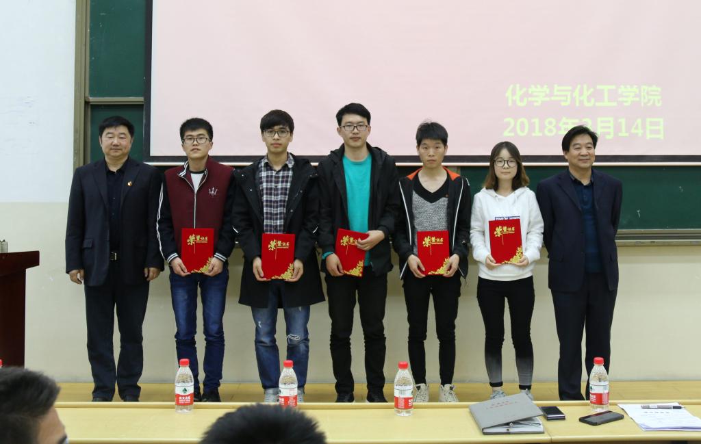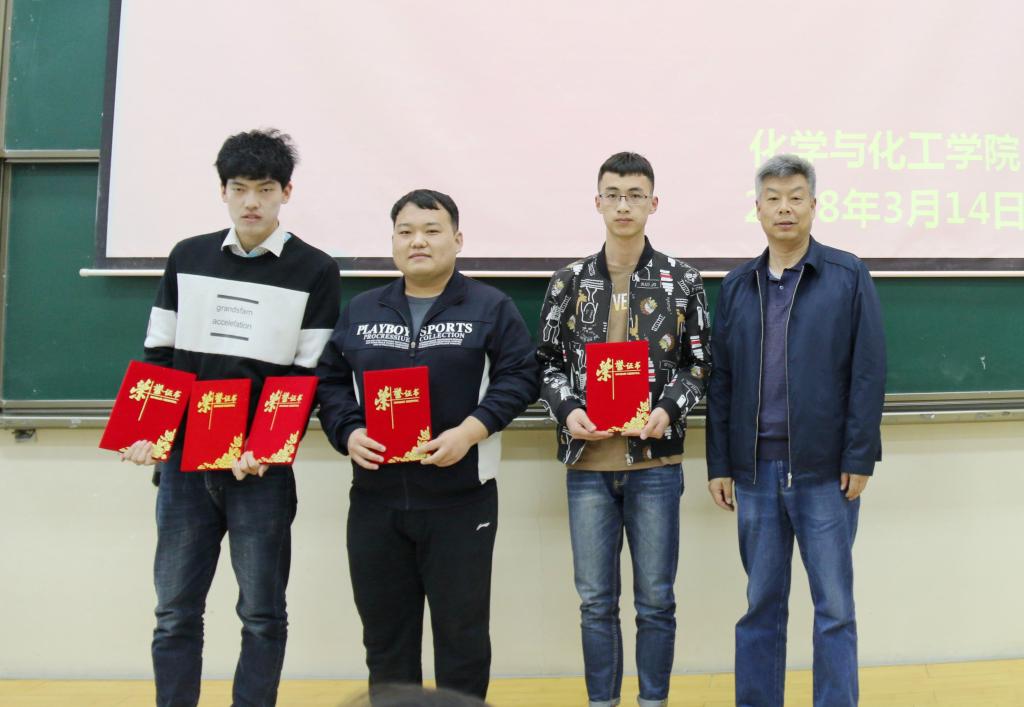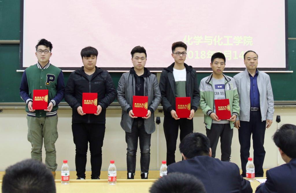 大会第一项,由教务处副处长薛皓、院党委书记舒永安和院长张琰图、院党委副书记刘雨录和化工教研室主任曹振恒老师分别为为获得化工设计竞赛西北赛区特等奖暨全国一等奖的“击硫勇进队”五位同学、全国二等奖的“硫光溢彩队”五位同学、三等奖的“擒硫赶队”五位同学及“一方队”五位同学颁奖。