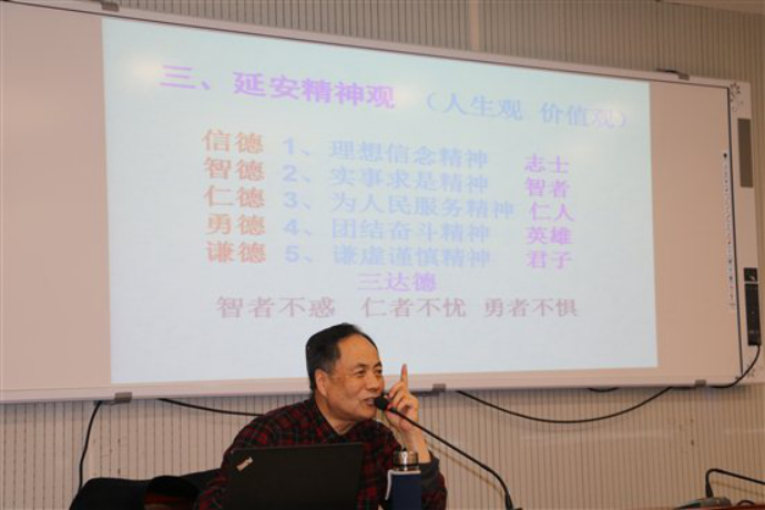 郭教授首先从辩证唯物论(存在论本体论)切入,从一个崭新的视角为同学们阐述什么是初心,为什么要守住初心。接着他从唯物辩证法(发展观方法论)的角度详细解释了如何做到不忘初心,如何切实履行使命。他指出,马克思主义的辩证唯物主义和历史唯物主义,是我们最锐利的思想武器,只有牢牢把握住这个思想武器,青年人的世界观、人生观、价值观才有正确的方向。尤其是理工科的同学们要学会观察分析国际问题,要运用唯物的、辩证的、历史的观点去研究长远的、根本的、发展的问题。最后,他阐述了中国智慧、辩证唯物论与延安精神的内在联系,鼓励同学们用延安精神武装头脑,做有延安精神特质的,又红又专的大学生。