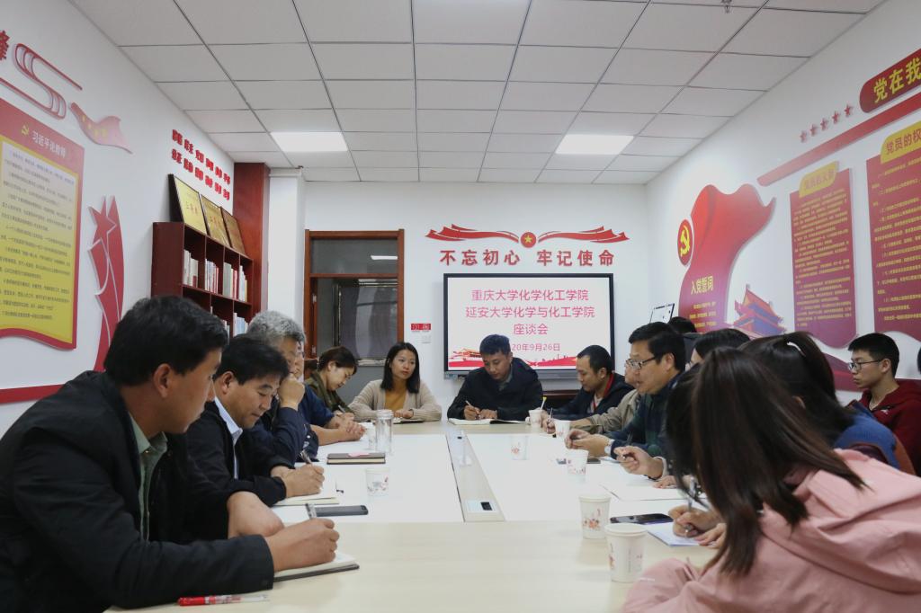 座谈会由院党委书记刘雨录主持。化工学院院长张琰图简要介绍了延安大学的校史校情及学院发展历程,就我院落实习近平总书记批示和全国教育大会精神,在学科建设、师资队伍建设、实验平台建设、博士点申报、工程认证、第五轮学科评估等情况和近五年来学院所取得的成绩,学院未来的发展定位和目标做了介绍,希望两个学院能够签订战略合作协议,进一步强化交流与合作等;团委书记徐菁分别从我院学生组织建设、学生党建特色、学生管理与教育等三个方面谈了学院学生工作的亮点。刘仁龙书记从重庆大学化工学院学院的发展历程、师资建设、优势学科、科研等方面的情况做了交流发言。