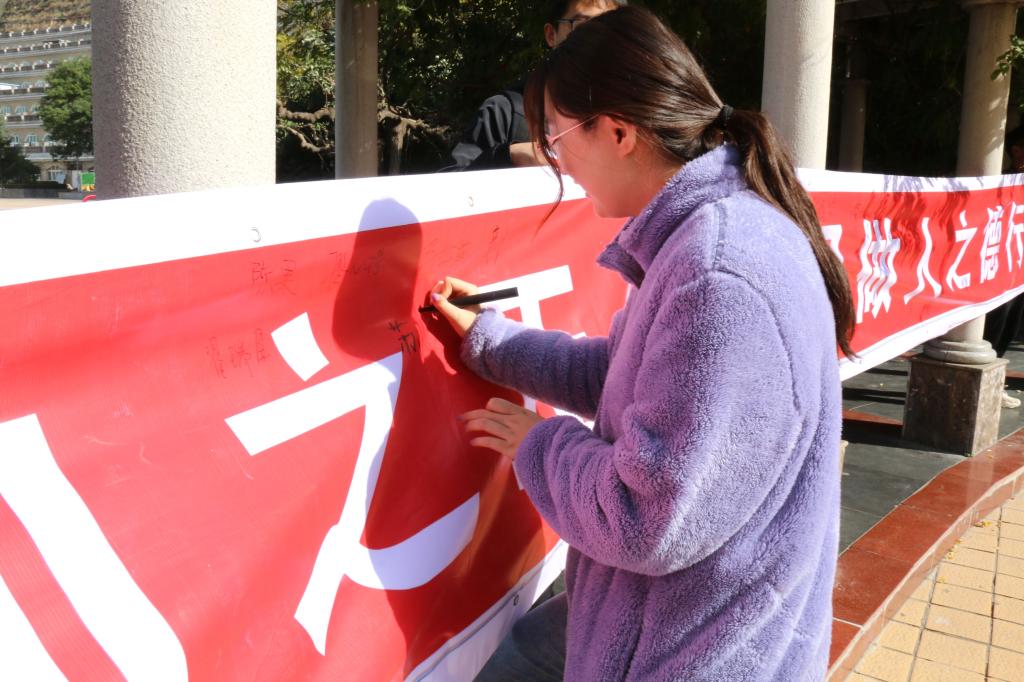 10月21日上午,化工学院团委、学生会在窑洞广场举行以“传播健康网络文化,共建平安和谐校园”为主题的网络文明自律公约签名活动。院党委副书记赵芝瑞、团委书记徐菁等及各年级学生代表参加了本次活动。