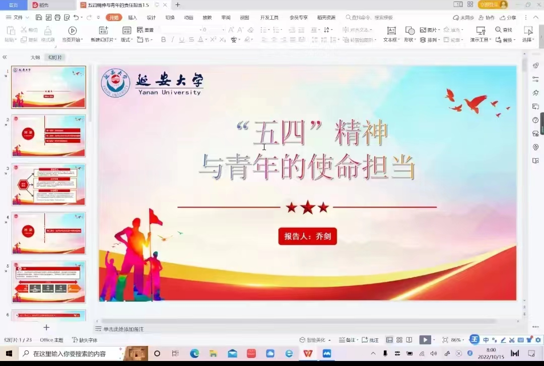 2022年10月15日上午八点,化学与化工学院第61期入党积极分子第五堂党课受疫情影响于线上开展。组织部副部长乔剑老师以“五四精神与青年的使命担当”为主题,为学院入党积极分子讲授了本次党课