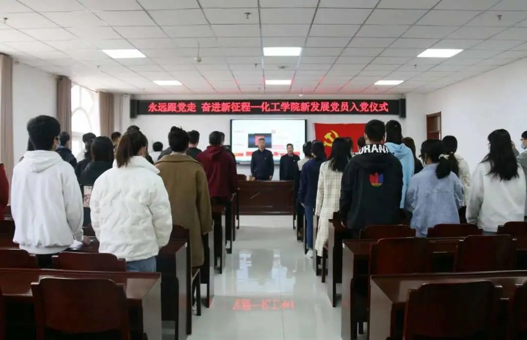 入党宣誓仪式在《没有共产党就没有新中国》的歌声中拉开序幕。张琰图为同学们上了党课,他希望与会党员把学习、工作同党的二十大精神紧密融合起来,提高学科竞争力,加强对外交流,聚焦特色,提升水平,打造一流的化工学院,谱写时代新篇章。